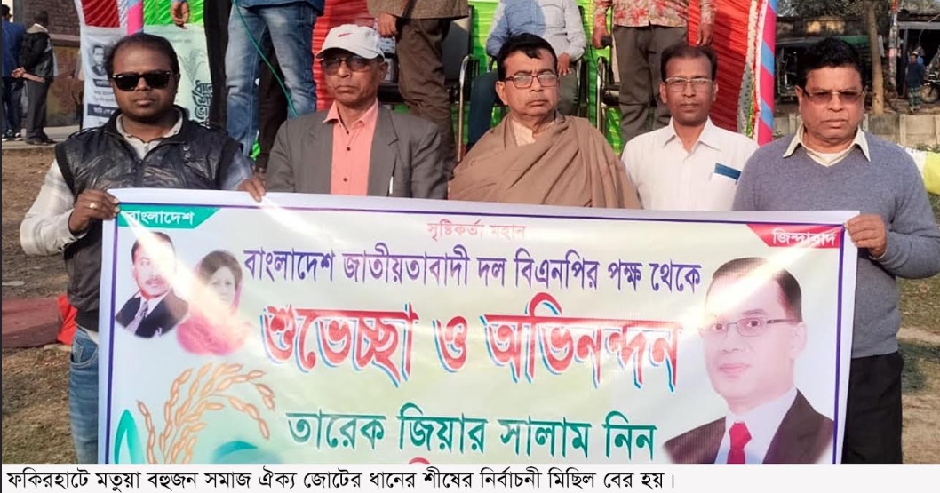 ফকিরহাট প্রতিনিধি : ত্রয়োদশ জাতীয় সংসদ নির্বাচনে প্রচারের শেষ দিনে অর্থাৎ সোমবার বিকেলে ফকিরহাটে মতুয়া বহুজন সমাজ ঐক্য জোটের উদ্যোগে বাগেরহাট-১ আসনের বিএনপির মনোনীত সংসদ সদস্য প্রার্থী কপিল কৃষ্ণ মন্ডলের (ধানের শীষ) পক্ষে ধানের শীষের নির্বাচনী মিছিল বের হয়। মিছিলটি উপজেলার বিভিন্ন সড়ক প্রদক্ষিণ শেষে বিএনপির প্রার্থী কপিল কৃষ্ণ মন্ডলের সমাবেশে যোগ দেন। ফকিরহাট উপজেলা মতুয়া বহুজন সমাজ ঐক্য জোটের আহবায়ক তুষার কান্তি মন্ডলের নেতৃত্বে এসময় সুভাষ চন্দ্র গোলদার, শীবনাথ রায়, নারায়ন গোলদার, প্রণব কুমার মন্ডল, দোবাশীষ কুমার শীষ, তুষার কান্তি দত্ত, বিপ্লব ঘোষ, উজ্জল মালাকার, সরস্বতী মজুমদার, লক্ষ্মী রায়সহ অন্যান্যরা।
