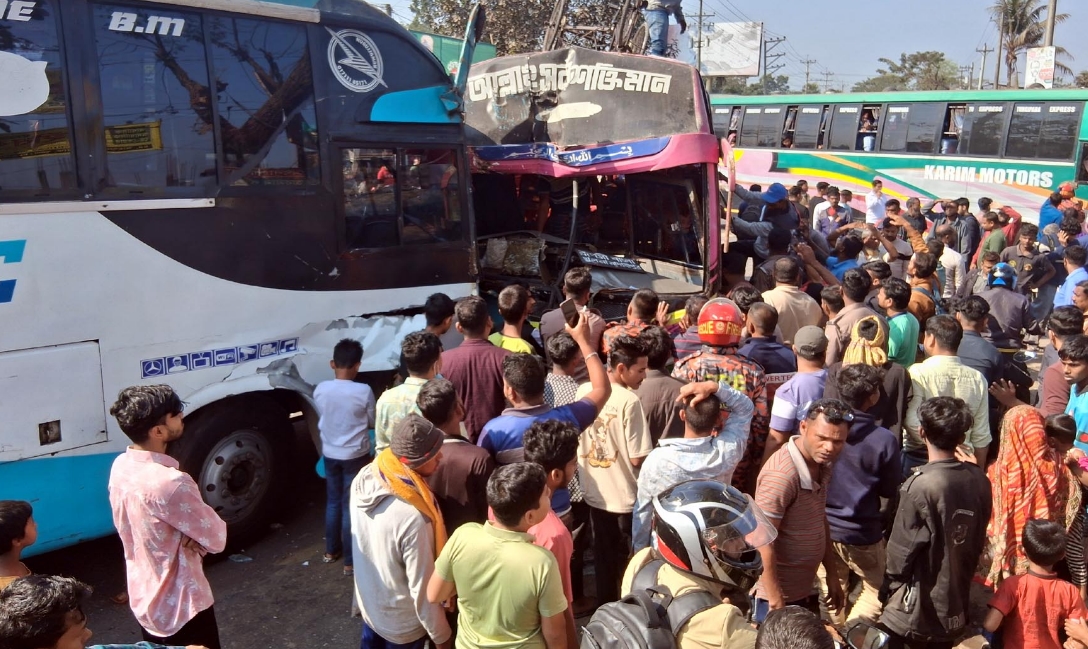 ফকিরহাট প্রতিনিধি : বাগেরহাটের ফকিরহাটে দুটি যাত্রীবাহী বাসের সাথে মূখোমূখি সংঘর্ষের ঘটনায় নারীসহ ১৫ জন আহত হয়েছেন। খুলনা-ঢাকা মহাড়কের ফকিরহাট বিশ্বরোড মোড় এলাকায় এ দুর্ঘটনা ঘটে। পুলিশ জানায়, রবিবার (১৫ ফেব্রূয়ারি) সকাল ১০টার দিকে ঢাকা থেকে ছেড়ে আসা বিএম লাইন পরিবহন খুলনার দিকে যাচ্ছিল। এসময় খুলনা থেকে ছেড়ে আসা মাদারীপুরগামী রূপসী বাসটি ফকিরহাট এসে পৌছালে নিয়ন্ত্রণ হারিয়ে ওই বাসের সাথে সংঘর্ষের ঘটনা ঘটে। ঘটনার পর পৌনে এক ঘন্টার মত যানবাহন চলাচল বন্ধ ছিল। আহতরা হলেন ব্যাংক কর্মকর্তা মানবেন্দ্র নারায়ন সরকার (৪৫), নাছিমা বেগম (৬০), শিল্পী মন্ডল ((৪০), রাজিয়া বেগম (৫০), সোনিয়া আক্তার (৩৫), নিরঞ্জন কুমার দাশ (৫০), হালিমা বেগম (৪২), মিনতী রানী ঢালী (৪০), কপিল রায় (৩৫) সহ ১৫জন আহত হয়েছেন। বাগেরহাট ফায়ার সার্ভিস এন্ড সিভিল ডিফেন্স এর উপ-সহকারী পরিচালক মো: বজলুর রহমান জানান, খবর পেয়ে ফকিরহাট ফায়ার সার্ভিসের একটি দল তাৎক্ষনিক ঘটনাস্থলে এসে আহতদের উদ্ধার করে উপজেলা স্বাস্থ্য কমপ্লেক্সে নিয়ে ভর্তি করে। আহতদের মধ্যে ৬জন নারী ও ৯জন পুরুষ রয়েছে। আহতরা বেশীরভাগ যাত্রী রূপসী বাসের বলে তিনি জানান। মোল্লাহাট হাইওয়ে থানার ভারপ্রাপ্ত কর্মকর্তা (ওসি) মো: আসাদুজ্জামান হাওলাদার বলেন, পুলিশ ঘটনাস্থলে উপস্থিত হয়ে পরিস্থিতি নিয়ন্ত্রণে আনে। দুই বাসের সামনের অংশ দুমড়ে-মুচড়ে গেছে। বাস দুটিকে সড়কের উপর থেকে সরিয়ে নেয়া হয়েছে। তবে রুপসী বাসের ব্রেক ফেল করার কারণে নিয়ন্ত্রণ হারিয়ে এ ঘটনা ঘটতে পারে।