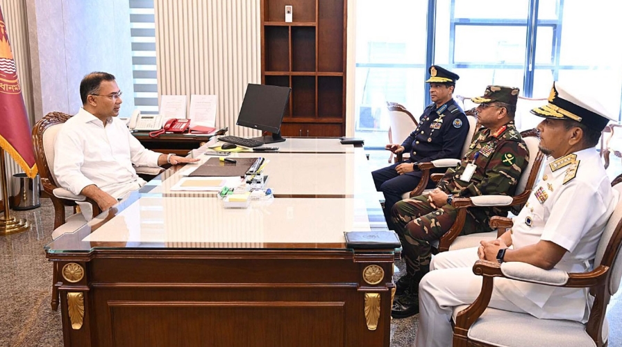 সেনাবাহিনী প্রধান জেনারেল ওয়াকার-উজ-জামান, নৌবাহিনী প্রধান অ্যাডমিরাল মোহাম্মদ নাজমুল হাসান এবং বিমানবাহিনী প্রধান এয়ার চিফ মার্শাল হাসান মাহমুদ খাঁন আজ বৃহস্পতিবার সকালে প্রধানমন্ত্রীর সঙ্গে সাক্ষাৎ করেন।
