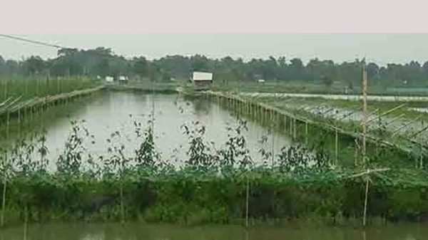 সাতক্ষীরা-খুলনা মহাসড়ক সংলগ্ন তালা উপজেলার নগরঘাটা ইউনিয়নের মিঠাবাড়ি বিলে শতশত বিঘা জমির মাছের ঘেরে মাচা পদ্ধতিতে লাউ, কুমড়া ও করলার চাষাবাদ করা হয়েছে। মাচায় ঝুলছে হাজার হাজার করলা, শতশত লাউ ও কুমড়া। একই সাথে ঘেরের পাড়ে লাগানো হয়েছে পুঁইশাক, ঢেঁড়স ও কলা গাছ।