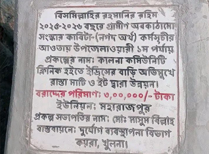 ২০২৫–২০২৬ অর্থবছরের গ্রামীণ অবকাঠামো সংস্কার কাবিটা (নগদ অর্থ) কর্মসূচির আওতায় ‘কালনা কমিউনিটি ক্লিনিক থেকে ইদ্রিসের বাড়ি পর্যন্ত রাস্তা মাটি ও ইট দ্বারা উন্নয়ন’ প্রকল্পে ৩ লাখ টাকা বরাদ্দ দেওয়া হয়। প্রকল্পটি বাস্তবায়নের দায়িত্বে ছিল দুর্যোগ ব্যবস্থাপনা বিভাগের কয়রা প্রকল্প বাস্তবায়ন কর্মকর্তা (পিআইও) অফিস।