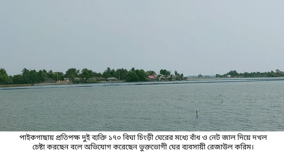 পাইকগাছায় ১৭০ বিঘা চিংড়ী ঘেরের মধ্যে বাঁধ দিয়ে দখল চেষ্টার অভিযোগ