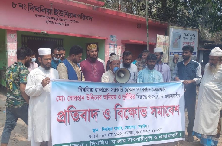 নড়াইল প্রতিনিধি : নড়াইলের লোহাগড়া উপজেলার দিঘলিয়া বাজারে সরকারি দোকান ঘর (চান্দিনা) বরাদ্দে দুর্নীতি অনিয়মের অভিযোগে প্রতিবাদ ও বিক্ষোভ সমাবেশ হয়েছে। দিঘলিয়া বাজার ব্যবসায়ীবৃন্দ ও এলাকাবাসির আয়োজনে শনিবার (৭ মার্চ) দুপুরের দিকে দিঘলিয়া ইউনিয়ন পরিষদ’র সামনে এ কর্মসূচী পালিত হয়। দিঘলিয়া বাজারের সরকারি দোকান ঘর বরাদ্দে দিঘলিয়া ইউপি চেয়ারম্যান বোরহান উদ্দিনের দুর্নীতি ও অনিয়মের বিরূদ্ধে ব্যবসায়ী ও এলাকাবাসি ফুসে উঠেছে। তারই বহি:প্রকাশ হিসেবে এ কর্মসূচী পালিত হয়। প্রতিবাদ ও বিক্ষোভ সমাবেশে বক্তব্য দেন দিঘলিয়া বাজার বণিক সমিতি’র সহ-সভাপতি এসএম ইমরান হোসেন, সাধারণ সম্পাদক সাগর সরদার, ব্যবসায়ী আইয়ুব মল্লিক, হাসান মোল্যা,সমাজ সেবক হাসান শেক, ব্যবসায়ী মিলন, সমাজ সেবক মাওলানা কামরুজ্জামান,কালাম শেখ, নজরুল ফকির, সাবেক ইউপি সদস্য বাদশা শেখ প্রমুখ। বক্তারা স্থানীয় দিঘলিয়া ইউপি চেয়ারম্যান বোরহান সহ কয়েকজন স্থানীয় ব্যক্তিবর্গের বিরূদ্ধে পরস্পর যোগসাজোশে দুর্নীতি অনিয়মের মাধ্যমে সরকারি দোকন ঘর বরাদ্দের অভিযোগ করে এ বরাদ্দ বাতিলের দাবি জানান। সংশ্লিষ্ট সূত্রে ও এলাকাবাসি সূত্রে জানা গেছে, লোহাগড়া উপজেলার দীঘলিয়া বাজারে সরকারি অর্থায়নে ১৬ টি দোকান ঘর করা হয়েছে। ওই সমস্ত ঘর লাখ টাকার বেশি নিয়ে ভাড়া দেয়া হয়েছে। দীঘলিয়া ইউনিয়ন পরিষদ চেয়ারম্যান বোরহান উদ্দিন, স্থানীয় মশিয়ার, আজম, তুহিন সম্মিলিতভাবে আর্থিক সুবিধা নিয়ে দোকান ঘরগুলি ভাড়া দিয়েছে। তারা ঘর ভাড়া দেয়ার ব্যাপারে সরকারের কোন নিয়ম নীতির তোয়াক্কা না করে আর্থিক সুবিধা নিয়ে নিজেরা লাভবান হয়েছেন। সচেতন এলাকাবাসি সুষ্ঠু তদন্ত সাপেক্ষে ওই বরাদ্দ বাতিল-পূর্বক ঘুষখোর দুর্নীতিবাজদের দৃষ্টান্তমুলক শাস্তির দাবি জানিয়েছেন।