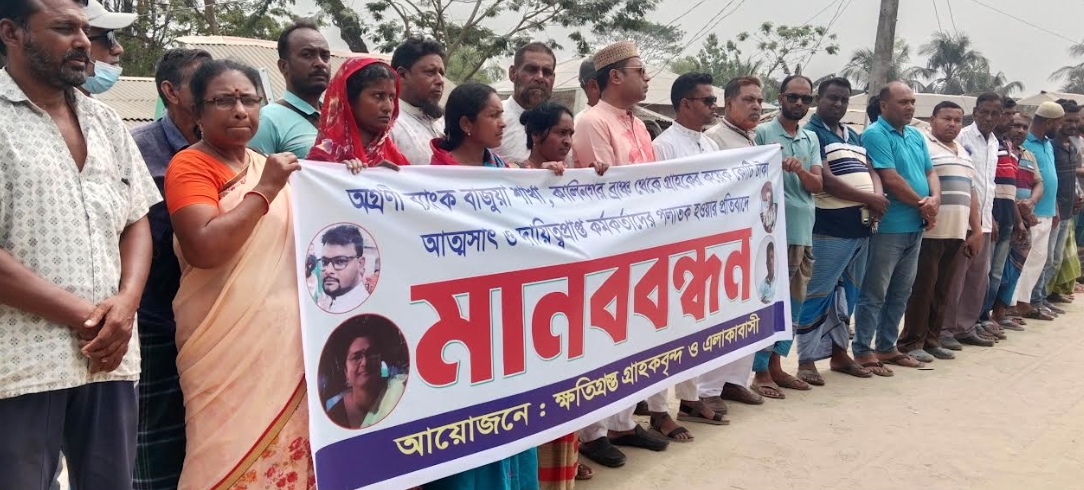 বেলা ১১ টায় ক্ষতিগ্রস্থ গ্রাহক ও এলাকাবাসীর যৌথ উদ্যোগে অনুষ্ঠিত মানববন্ধন ও সমাবেশে ক্ষতিগ্রস্থ এলাকার হতদরিদ্র তৃনমূল নারী গ্রাকহকরা অশ্রু সজল চোখে তাদের কষ্টার্জিত টাকা ফেরত পাওয়ার দাবীতে আইন প্রয়োগকারী সংস্থা এবং সংশ্লিষ্ট সকলের সহযোগীতা কামনা করেন। স্থানীয় ইউপি সদস্য নুর হোসেনের সহসভাপতিত্বে অনুষ্ঠিত সমাবেশে বক্তৃতা সমাবেশে বক্তৃতা করেন খুলনা জেলা বিএনপির সাবেক যুগ্ম আহবায়ক ও দাকোপ উপজেলা নির্বাচনে সাম্ভব্য চেয়ারম্যান প্রার্থী আশরাফুল আলম নান্নু, বিএনপিনেতা হাইদুল সানা, শাহাবুদ্দিন গাজী, ক্ষতিগ্রস্থ গ্রাহক স্বপ্না সরদার, হায়দার গাজী, রেবতী ঘরামী, অভিজিত মন্ডল, জামেলা খাতুন, সবিতা সরকার, পদ্মদাস সোনালী, শিখ বৈষ্ণব, রত্না মন্ডল, ছন্দা মন্ডল, দীপংকর মন্ডল, অমর মন্ডল, জয় গোলাপ বৈষ্ণব প্রমুখ। তারা ঘটনায় জড়িত অগ্রনী ব্যাংক বাজুয়ার শাখা ব্যবস্থাপক সুকান্ত মন্ডল, কালীনগর বাজার এজেন্ট শাখার ম্যানেজার শেখর হালদার এবং ক্যাশিয়ার উৎপেলেন্দু বিশ^াসকে অভিযুক্ত করে তাদের বিরুদ্ধে আইনানুগ ব্যবস্থা এবং টাকা ফেরত পাওয়ার জন্য সংশ্লিষ্ট সকলের সহযোগীতা কামনা করেন। উল্লেখ্য কামারখোলা শিবনগর গ্রামের গ্রাহক অভিজিৎ মন্ডল ৭ লাখ তার শশুরের মাধ্যমে জমা রাখে। ঘটনার পর জামাইয়ের টাকা এভাবে খোয়া যাওয়ায় লজ্জা অপমানে তার শশুর দীপংকর মন্ডল কৈলাশগঞ্জে নিজ বাড়ীতে গত ৮ মার্চ গলায় রশি দিয়ে আত্নহত্যা করে।