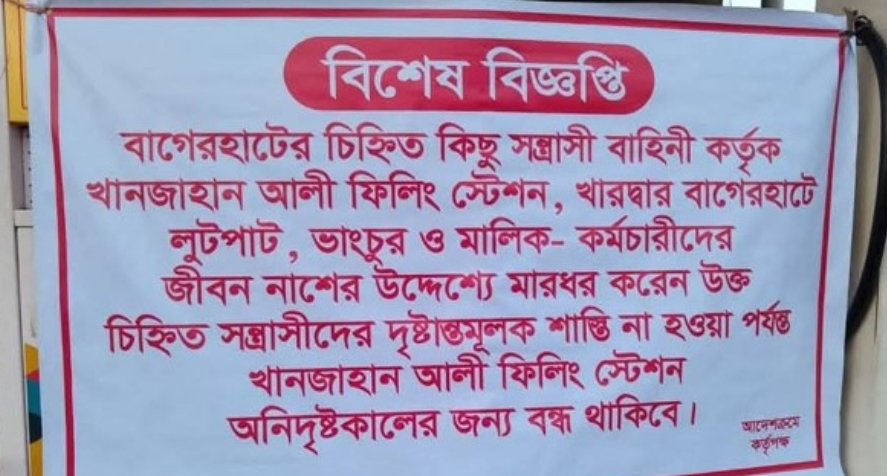 এই বিজ্ঞপ্তিতে লেখা হয়, বাগেরহাটের চিহ্নিত কিছু সন্ত্রাসী বাহিনী কর্তৃক খানজাহান আলী ফিলিং স্টেশন, খারদ্বার বাগেরহাটে লুটপাট, ভাঙচুর ও মালিক-কর্মচারিদের জীবন নাশের উদ্দেশ্যে মারধর করেন। উক্ত চিহ্নিত সন্ত্রাসীদের দৃষ্টান্তমূলক শাস্তি না হওয়া পর্যন্ত খানজাহান আলী ফিলিং স্টেশন নির্দিষ্টকালের জন্য বন্ধ থাকবে।