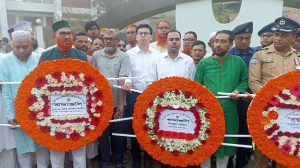 জাতীয়তাবাদী দল থানা ও পৌর বিএনপির পক্ষে এফ এম শামীম আহসান, জেলা বিএনপি নেতা মনিরুল হক ফরাজী, পৌর বিএনপির সভাপতি শিকদার ফরিদুল ইসলাম, সাধারণ সম্পাদক আসাদুজ্জামান মিলন, যুবদলের পক্ষে বিএম রেজাউল করিম সোহাগ, স্বেচ্ছাসেবক দল, শ্রমীক দল, ছাত্রদলসহ অঙ্গসংগঠনের নেতৃ¦বৃন্দ পৃথক পৃথক পুষ্প মাল্য অর্পণ করেন। মুক্তিযোদ্ধা সংসদদের পক্ষে উপজেলা কমান্ডার বীর মুক্তিযোদ্ধা শাহ আলম বাবুল। এ ছাড়াও উপজেলা স্বাস্থ্য কমপ্লেক্স, ফায়ার সার্ভিস, পৌরসভা, সরকারি বেসরকারি বিভিন্ন শিক্ষা প্রতিষ্ঠান, বাংলাদেশ স্কাউটস, শিক্ষক সমিতি মাল্য দান করেন। পরে বীর মুক্তিযোদ্ধা স ম কবির আহম্মদ মধু, বীর প্রতীক আলী আহম্মেদের কবর জিয়ারত করেন উপজেলা প্রশাসন।