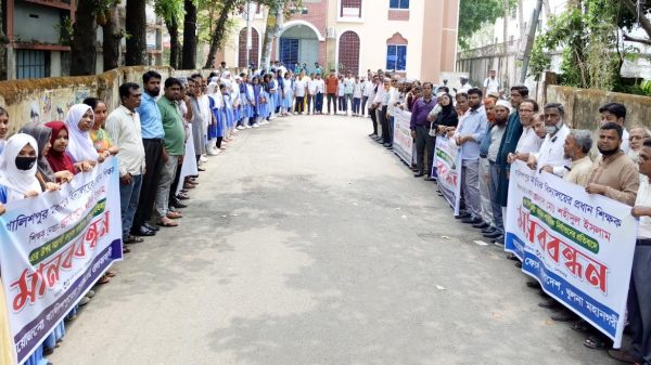 সোমবার (৩০ মার্চ) সকাল সারে ১১ টায় খুলনার বিভিন্ন শিক্ষা প্রতিষ্ঠানের প্রধান শিক্ষক, শিক্ষক প্রতিনিধি, অভিভাবক ও স্থানীয় গণ্যমান্য ব্যক্তিবর্গের উপস্থিতিতে মানববন্ধন কর্মসূচি অনুষ্ঠিত হয়।