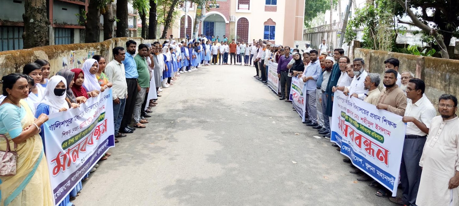 সোমবার (৩০ মার্চ) সকাল সারে ১১ টায় খুলনার বিভিন্ন শিক্ষা প্রতিষ্ঠানের প্রধান শিক্ষক, শিক্ষক প্রতিনিধি, অভিভাবক ও স্থানীয় গণ্যমান্য ব্যক্তিবর্গের উপস্থিতিতে মানববন্ধন কর্মসূচি অনুষ্ঠিত হয়।