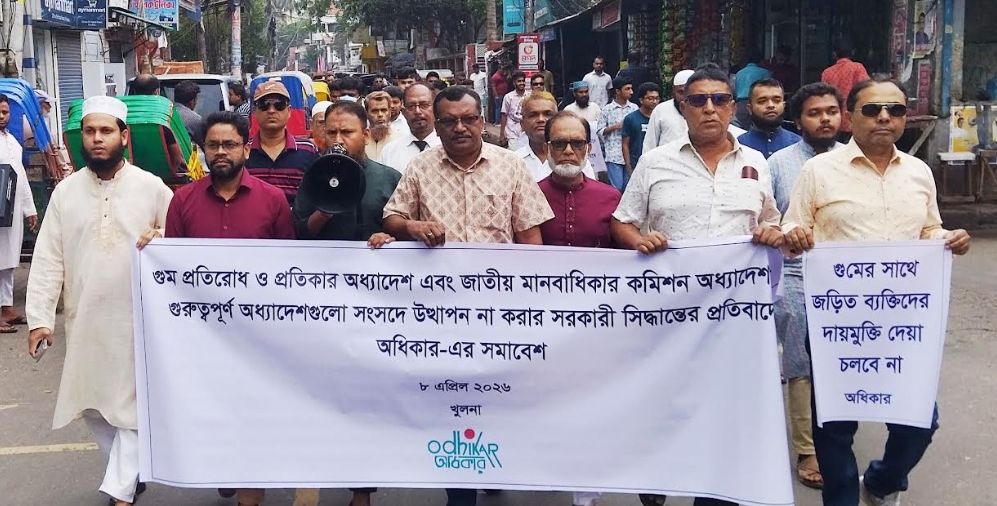 নিজস্ব প্রতিবেদক : গুম প্রতিরোধ অধ্যাদেশ ও জাতীয় মানবাধিকার কমিশন অধ্যাদেশসহ অন্তবর্তীকালীন সরকারের সময়ে জারি করা ১৬ টি গুরুত্বপূর্ণ অধ্যাদেশ বাতিলের প্রক্রিয়া বন্ধ করে অবিলম্বে আইনে পরিণত করার দাবিতে খুলনায় মানববন্ধন ও সমাবেশ অনুষ্ঠিত হয়েছে। বুধবার সকাল সাড়ে ১০ টায় দেশের শীর্ষ মানবাধিকার সংগঠন 'অধিকার' খুলনা ইউনিটের পক্ষ থেকে এ কর্মসূচির আয়োজন করা হয়। খুলনা প্রেসক্লাবের সামনে থেকে একটি র্যালি বের হয়ে নগরীর পিকচার প্যালেস মোড়ে গিয়ে মানববন্ধন ও সমাবেশের মধ্য দিয়ে কর্মসূচির সমাপ্তি হয়।