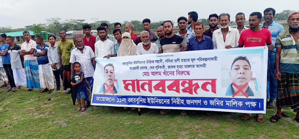 মঙ্গলবার বিকেল ৫টায় উপজেলার বহরবুনিয়া ইউনিয়নের কলেজ বাজার এলাকায় এ মানববন্ধনে শতাধিক নারী পুরুষ অংশ নেয়। মানববন্ধন থেকে এলাকাবাসি অভিযোগ করে বলেন, বহরবুনিয়া গ্রামের ২নং ওয়ার্ডের ৮০ বিঘা একটি চিংড়ি ঘের স্থানীয় জমির মালিকসহ ছাত্রদল নেতা আলি আজিম বিগত ২ বছর ধরে হাড়ির টাকা পরিশোধ করে যৌথভাবে এ ঘেরটি পরিচালনা করে আসছে। গত ৫ই আগষ্টের পর কথিত ফ্যাসিষ্টদোষর আলম খানসহ বহিরাগত লোকজন নিয়ে স্থানীয়দের এ চিংড়ি ঘেরটির মাছ ধরে নিয়ে যায়। বর্তমানে ৮০ বিঘার এ চিংড়ি ঘেরটি দখলে নেওয়ার পায়তারা করছে। সম্প্রতি ২ এপ্রিল ছাত্রদল নেতা আলি আজিমের বিরুদ্ধে ষড়যন্ত্রমূলক ঘের দখলের অভিযোগ এনে বহিরাগত লোকজন দিয়ে একটি মানববন্ধন করে বিশৃংখলা সৃষ্টি করে জমির মালিকদের হয়রানি করছেন। তারা এ ঘটনার তীব্র নিন্দা ও প্রতিবাদ জানিয়ে প্রশাসনের হস্তক্ষেপ কামনা করছেন।