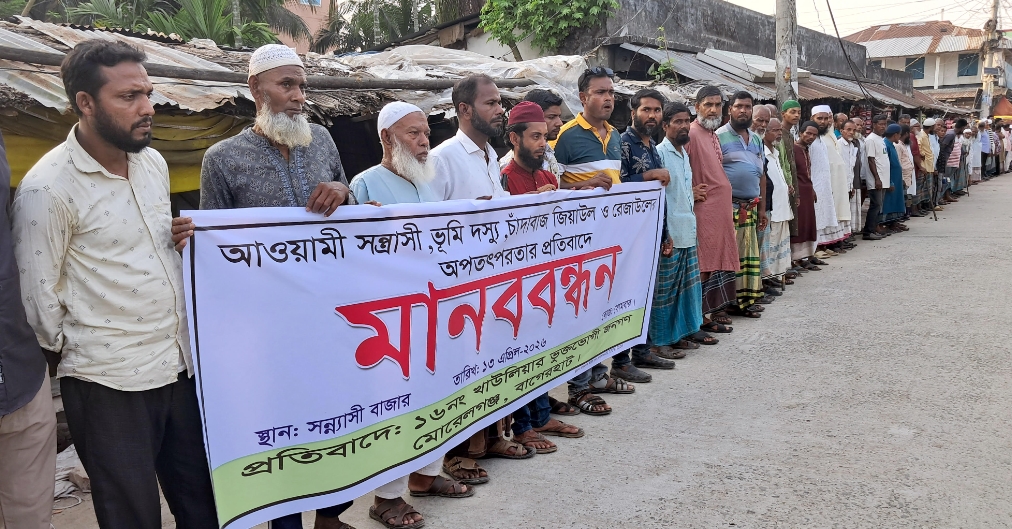 মোরেলগঞ্জ প্রতিনিধি: বাগেরহাটের মোরেলগঞ্জে আপন দুই ভাইয়ের অপতৎপরতার প্রতিবাদে মানববন্ধন অনুষ্ঠিত হয়েছে। সোমবার(১৩ এপ্রিল) বিকেল ৫টার দিকে সন্ন্যাসী বাজার এলাকায় অনুষ্ঠিত মানববন্ধনে বিভিন্ন শ্রেণি-পেশার শতাধিক মানুষ অংশ গ্রহন করেন। মানববন্ধনে সন্ন্যাসী গ্রামের আপন দুই ভাই মো. জিয়াউল হাসান ও রেজাউল আহসানের বিরুদ্ধে ভূমিদস্যুতা, মারপিট, মিথ্যা মামলায় হয়রানী ও জালিয়াতির অভিযোগ তোলেন স্থানীয়রা।