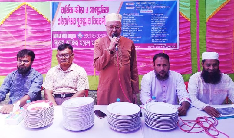 বিজ্ঞপ্তি : খুলনার ডুমুরিয়া উপজেলার শরাফপুরে দারুল আজিজ মডেল মাদ্রাসার বার্ষিক ক্রীড়া ও সাংস্কৃতিক প্রতিযোগিতার পুরস্কার বিতরণী অনুষ্ঠিত হয়েছে। শনিবার (১৮ এপ্রিল) বেলা সাড়ে ১১ টায় উপজেলার শরাফপুর ইউনিয়নের শরাফপুর গ্রামের দারুল আজিজ মডেল মাদ্রাসায় এ পুরস্কার বিতরণী অনুষ্ঠানের আয়োজন করা হয়। অনুষ্ঠানে প্রধান অতিথির বক্তৃতা করেন, খুলনা জেলা বিএনপির যুগ্ম আহবায়ক, সাবেক ইউপি চেয়ারম্যান, বিশিষ্ট ব্যবসায়ী, সমাজ সেবক ও ডুমুরিয়া উপজেলা চেয়ারম্যান পদে বিএনপির মনোনয়ন প্রত্যাশী প্রার্থী আলহাজ্ব গাজী তফসীর আহমেদ। মাদ্রাসার প্রতিষ্ঠাতা পরিচালক হাফেজ মো. ওয়াহিদুজ্জামানের পরিচালনায় প্রধান বক্তার বক্তৃতা করেন, কুয়েট'র অবসরপ্রাপ্ত এডিশনাল কন্ট্রোলার ও (অব:) মেজর ইঞ্জিনিয়ার বি এম আসাদুজ্জামান।