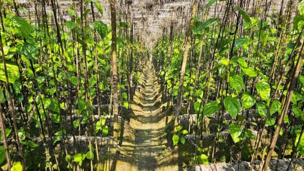 দশমিনা(পটুয়াখালী)প্রতিনিধি : পটুয়াখালীর দশমিনা উপজেলায় আবহাওয়া অনুকূলে থাকায় বাণিজ্যিকভাবে পানের চাষাবাদ করে ¯^াবল¤^ী হওয়ার ¯^প্ন দেখছেন পান চাষী অমল ব্যাপারি| একটি পানের বরজ থাকলেই সারা বছরের বাজার খরচ নিয়ে চিন্তা করতে হয় না| উৎপাদন খরচ কম এবং লাভও বেশি| তাই বছরের পর বছর বংশ পরস্পরায় পান চাষ করা যায়| তার সাফল্য দেখে উপজেলার বিভিন্ন গ্রামে আবাদি অনাবাদি ও পতিত জমিতে পান চাষে কৃষক-কৃষানিদের আগ্রহ সৃষ্টি হয়েছে| একদিকে যেমন চাঙ্গা হচ্ছে গ্রামীন অর্থনীতি, অন্যদিকে ¯^াবল¤^ী হচ্ছেন এলাকার প্রান্তিক কৃষক পরিবার| বর্তমানে হাট-বাজারে পানের দাম ও চাহিদা খুব বেশি| তাই অন্য ফসলের তুলনায় পান চাষ অধিক লাভজনক হওয়ায় অনেকেই পান চাষে ঝুঁকে পড়ছে| উপজেলার ৭টি ইউনিয়নের বিভিন্ন এলাকায় ছোট-বড় প্রায় সাড়ে তিন শতাধিক পানের বরজ রয়েছে| এই সব এলাকার উৎপাদিত পান দেশের বিভিন্ন স্থানে সরবরাহ করা হচ্ছে| উপজেলার প্রায় পাঁচ শতাধিক কৃষক পরিবার শুধুমাত্র পান চাষ করে ¯^াল¤^ী হয়ে উঠছেন| তাদের অনেকেই শ্রম ও অধ্যবসায়কে কাজে লাগিয়ে পান চাষ করে বদলে দিচ্ছেন নিজেদের ভাগ্য|