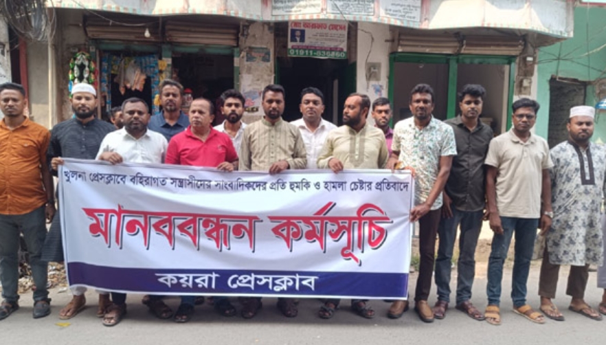 কয়রা প্রতিনিধি : খুলনা প্রেসক্লাবে বহিরাগত সন্ত্রাসীরা ঢুকে কর্মরত সাংবাদিকদের ওপর হামলা ও হুমকির ঘটনার প্রতিবাদে কয়রায় মানববন্ধন অনুষ্ঠিত হয়েছে। আজ ঙ্গলবার (২৮ এপ্রিল) কয়রা প্রেসক্লাবের সামনে এ মানববন্ধন অনুষ্ঠিত হয়। কয়রা প্রেসক্লাব আয়োজিত এ মানববন্ধনে সভাপতিত্বে করেন সংগঠনের নবনির্বাচিত সভাপতি সমকাল পত্রিকার কয়রা প্রতিনিধি শেখ হারুন অর রশিদ। এ সময় বক্তৃতা করেন ও অন্যান্যের মধ্যে উপস্থিত ছিলেন সংগঠনটির সাবেক সাধারণ সম্পাদক কামাল হোসেন, প্রথম আলোর কয়রা-পাইকগাছা প্রতিনিধি ইমতিয়াজ উদ্দিন, সহ-সভাপতি এড. আবু বকর সিদ্দিক, মোঃ আলাউদ্দিন, যুগ্ম সম্পাদক নিতিশ সানা, মোস্তাফিজ রহমান, কোষাধ্যক্ষ সাইফুল ইসলাম, সাংগঠনিক সম্পাদক জিএম মোনায়েম, দপ্তর সম্পাদক হাফিজুর রহমান, প্রচার সম্পাদক মোস্তফা রেজওয়ানুল করিম, নির্বাহী সদস্য শেখ সিরাজুদৌলা লিংকন, সদস্য বিএম আল আমিন, ইউনুস আলী, মুশফিকুর রহমান, মাছুম বিল্লাহ, আতাউর রহমান তুহিন ফরহাদ হোসেন, আশিকুজ্জামান প্রমুখ। সঞ্চালনা করেন প্রেসক্লাবের সাধারণ সম্পাদক এনটিভি'র অনলাইন করেসপন্ডেন্ট তরিকুল ইসলাম। মানববন্ধনে বক্তারা বলেন, সংবাদপত্র ও গণমাধ্যমের স্বাধীনতা রক্ষায় এ ধরনের হামলা ও ভয়ভীতি কোনোভাবেই মেনে নেওয়া যায় না। এটি শুধু ব্যক্তি আক্রমণ নয়—এটি গণমাধ্যমের স্বাধীনতার ওপর আঘাত। বক্তারা আরও বলেন, সাংবাদিকদের নিরাপত্তা নিশ্চিত না হলে গণতন্ত্র ও সত্য প্রকাশের পথ বাধাগ্রস্ত হবে। দ্রুত হামলাকারীদের শনাক্ত করে আইনের আওতায় এনে কঠিন শাস্তির দাবি জানান তারা।