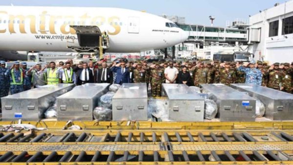 ডেস্ক রিপোর্ট : সুদানে জাতিসংঘ শান্তিরক্ষা মিশন ঘাঁটিতে সন্ত্রাসীদের ড্রোন হামলায় নিহত ছয় বাংলাদেশি শান্তিরক্ষীর মরদেহ দেশে পৌঁছেছে। শনিবার (২০ ডিসেম্বর) বেলা ১১টা ৫ মিনিটে ঢাকার হযরত শাহজালাল আন্তর্জাতিক বিমানবন্দরে